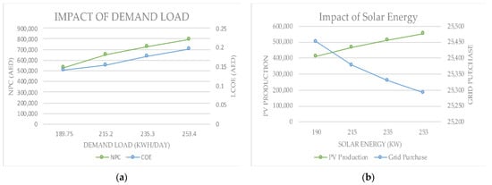To identify the most feasible and cost-effective renewable energy policy mechanism for the UAE, this research employs the HOMER grid software to analyze the behind-the-meter system. The software takes into account the critical factors affecting renewable energy deployment, such as the location, solar radiation, PV system components, and the grid connection scheme. The schematic diagram presented in Figure 2 shows the primary inputs used in the software, which mainly relate to electrical demand. Furthermore, to design and simulate the system’s output, additional information is used to provide the best technoeconomic output based on the levelized cost of energy (LCOE), net present cost (NPC), and initial capital cost.