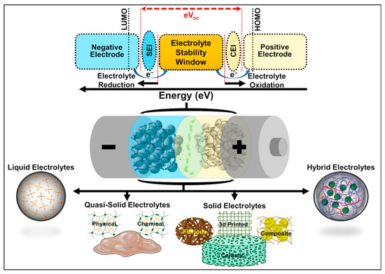 Classification of electrolytes used in SIBs and corresponding energy diagram of the electrolyte interface with positive and negative electrodes. Reproduced with the permission of reference [15].