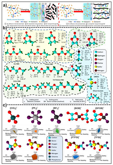 Furthermore, a solvent with a low donor number shows a lower kinetic energy barrier for Na+ desolvation at the interfaces. If the viscosity of the solvent is low, the ionic conductivity of the electrolyte will be high. This means that all these properties should be taken into consideration before the formulation of electrolytes. The physical and chemical properties of common solvents used in SIB electrolytes are shown in Figure 2b.