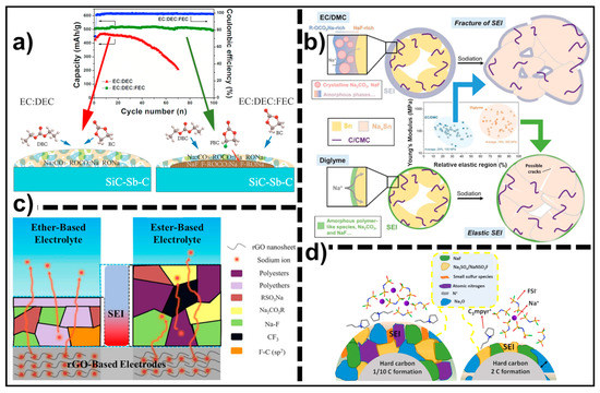 Ethylene carbonate (EC), propylene carbonate (PC), butylene carbonate (BC), diethyl carbonate (DEC), dimethyl carbonate (DMC), ethyl methyl carbonate (EMC), and their mixtures are the most used ester-based solvents for SIBs [29]. Figure 3 shows the effect of ester-based and ether-based electrolytes on SEI formation on certain negative electrodes for SIBs. Komaba et al. studied the effects of carbonate esters on the SEI of hard carbon (HC) anodes and cycling performance. They found that the electrochemical performance and cycle life of electrolyte solutions was PC > EC > BC solution containing 1 M NaClO4 at 25 mA g−1. They have also studied binary solvents and found cyclic performances as EC:DEC > EC:EMC > EC:DMC solution containing 1 M NaClO4 at 25 mA g−1. They have also discovered that adding 2% VC resulted in a negative effect on the Na insertion into the HC electrodes [41]. On the other hand, Maça and Etacheri demonstrated that a 3% VC additive in 1 M NaClO4/PC electrolyte had excellent pseudocapacitive Na-ion diffusion on the SEI of the TiO2 anode. After 750 cycles, a TiO2 nanosheet anode in a Na-ion half cell configuration retained around 90% of its initial capacity and almost 100% Coulombic efficiency. Na-ion half cells containing VC-free electrolyte solution retained only 16% of their initial capacity while maintaining 98% Coulombic efficiency [41].