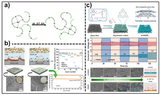 Gel polymer electrolytes are less capable of wetting electrodes than liquid electrolytes. This increases charge transfer resistance between the electrode and electrolyte. To reduce charge transfer resistance between electrodes and electrolytes, electrolytes can be synthesized on the surface of electrodes by in situ polymerization. Ma et al. synthesized poly(1,3-dioxolane)-based quasi-solid electrolytes by in situ polymerization for sodium metal batteries. Anode/cathode interfaces were conformally coated by gel electrolyte and this eliminated geometrical gaps and decreased charge transfer resistance with the aid of in situ polymerization. FEC greatly enhanced ionic transport while acting as a plasticizer to prevent crystallization during polymerization. In addition, FEC increased the mechanical uniformity of the electrolyte–electrode interfaces during battery cycling while creating a stable SEI at the anode that was rich in NaF. (Figure 4b) [85].