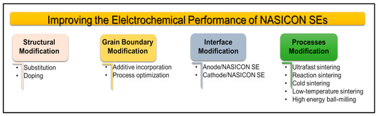 As shown in Figure 5, numerous studies have been performed to design and develop NASICON-type electrolytes with improved performance, primarily via structural modification (addition or substitution of dopants) [108] and grain boundary modification [114]. Some modifications were also performed to obtain NASICON structures with better performance at low temperatures with simpler processes such as ultrafast sintering [115] and high energy ball-milling [116]. Other approaches are also conducted, such as interfacial compatibility modifications [117].