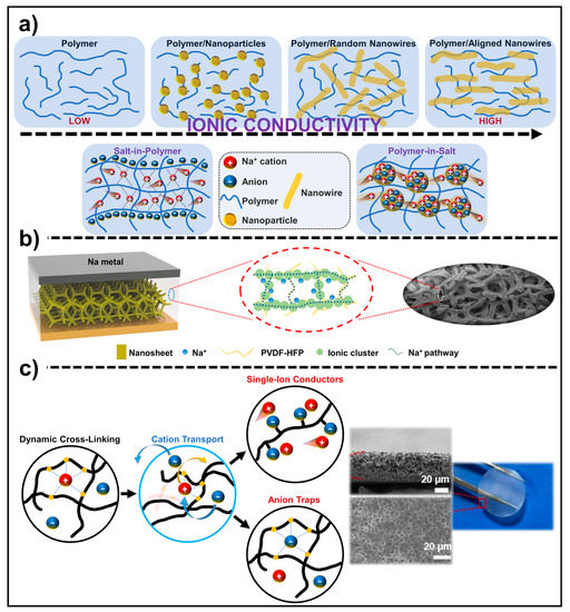 The segmental motion of polymer chains provides sodium-ion conduction in polymer-based electrolytes (Figure 4a). For this reason, polymers used in polymer electrolytes should have a low glass transition temperature (Tg) and low crystallinity. In polymer electrolytes, polymer should be able to couple with sodium ions, as well as dissolve sodium salt, for improved conductivity. Polar groups on the chain backbone or side chains (-O-, -S-, -NH-, -CN, -Cl, -SO3, etc.) are efficient building blocks for dissolving sodium salts. Although polyethylene oxide (PEO) is used in polymer-based electrolytes in many studies for SIBs, polymers such as poly(vinylidene fluoride) (PVDF) [78], poly(vinylidene fluoride-co-hexafluoro-propylene) (P(VdF-HFP)) [79], polyacrylonitrile (PAN) [80], polyvinyl chloride (PVC) [81], polyvinylene carbonate (PVN) [82], and polymethyl methacrylate (PMMA) [83] can also be used for a polymer matrix.