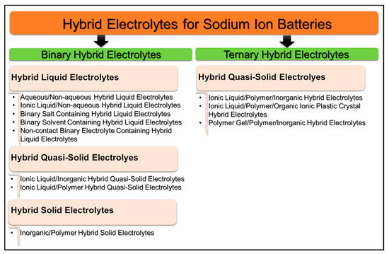 The hybrid electrolyte (HE) is one of the recent approaches for improving the performance of SIBs. The term “hybrid” defines any system consisting of at least two different species. As explained in the previous sections, each electrolyte has advantages and limitations. Hybrid SIBs are important alternatives that combine the benefits of each system and minimize their limitations. In other words, they are promising systems in terms of offering high energy density, long life, improved safety, and reduced risks. In this review, HEs are classified into binary and ternary electrolytes based on the number of components, as shown in Figure 8. Since most of the polymer electrolytes require salt, “polymer + salt” are considered as one material and evaluated as a polymer component of the hybrid electrolyte.