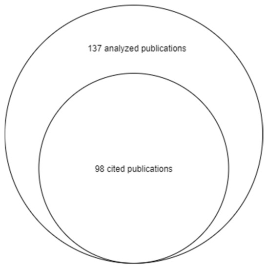 In this research, there were 137 publications from the years 1995–2022 analyzed. There were 98 cited publications that were at least cited once (Figure 2). This result was generated on 18 January 2023, as presented in Table 2 and Figure 1, stages IV and V.