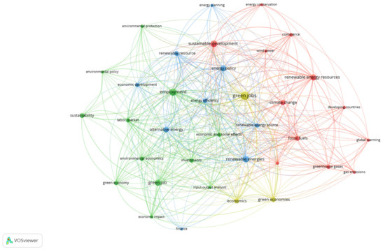 In Figure 3, there are four subnetworks of the bibliometric map presenting the subject of GJs [29] in the energy sector visible. In this bibliometric map, there are keywords presented as nodes [12]. Between these keywords, there are lines that represent the connections and publications in which those co-occurring keywords were used. Among all the nodes, the biggest keywords, distinguished by size, are “green jobs”, “employment”, and “sustainable development”. The biggest nodes are placed in the center of Figure 3, which also represents the biggest density of the edges. The keywords distinguished automatically in colors are thematically related. The red and blue clusters are connected to the energy sector transformation, while green and yellow are more related to economics, finance, and management.