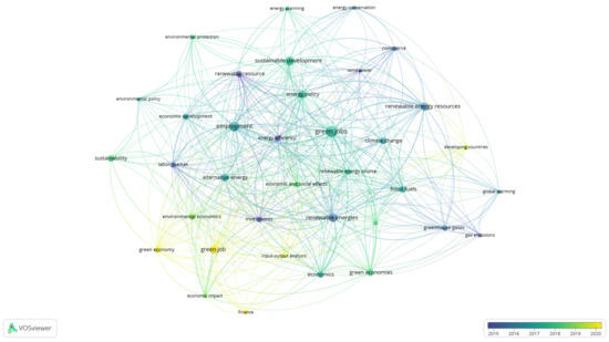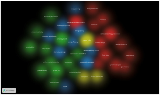 To check the strength of the presented keywords in Figure 3, the density visualization was proposed in Figure 5. There, the three most often used keywords (22 and more occurrences in Table 3) are presented on the blue background in Figure 5. Those keywords create the centrally located triangle, and those are “green jobs” (33 occurrences), employment (25), and sustainable development (22). There are also other keywords with a significant number of occurrences; however, they are strongly related to the indicated three clusters and leading keywords. Therefore, the weight of the keyword indicates its importance. In the visualization of the map presented in Figure 5, keywords with a higher weight are shown more prominently than items with a lower weight [87,88].