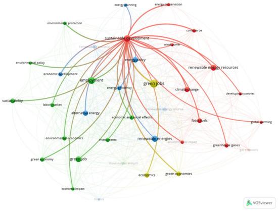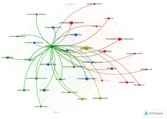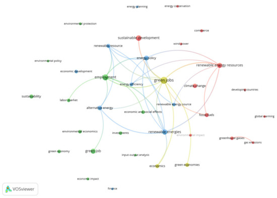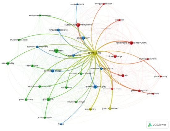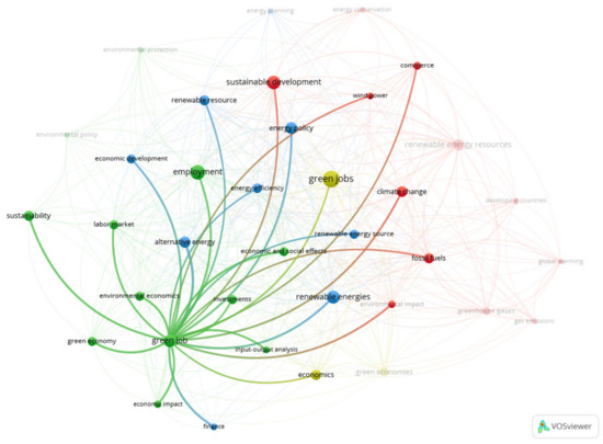 Keyword “green jobs” relations with other keywords. Source: Authors’ elaboration in VOSviewer software (1.6.18 version).
