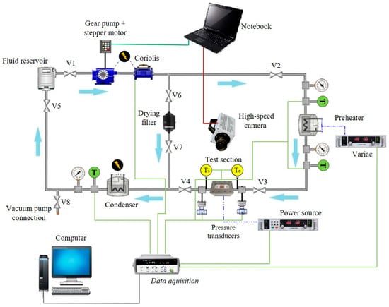 Figure 1 shows the experimental apparatus used in the present study. The working fluid is pumped from a reservoir to the flow loop; the HFE-7100 flow rate is set by a Coriolis mass flow meter (Yokogawa ROTAMASS Total Insight with 0.2% mass flow accuracy) installed just upstream of the preheater (consisting of a horizontal copper tube heated by an electrical tape resistance). There is a bypass line used for the test facility maintenance. The pressure drop between inlet and outlet plenums is measured by two pressure transducers (OMEGA PX309 model, with 0.25% accuracy). The flow temperature is measured using previously calibrated K-type thermocouples (uncertainty of 0.3 °C) in the inlet and outlet plenums (both in contact with the fluid). The working fluid is cooled by a condenser and then returned to the reservoir, as shown in Figure 1.