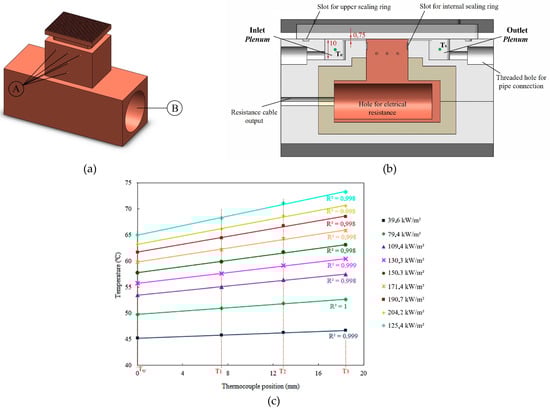The design of the heat sink test section in different views is shown in Figure 2, including a cutaway to view internal details and elemental descriptions (Figure 2b). Five holes (1 mm diameter) were drilled in the copper block to accommodate K-type thermocouples (Figure 2a, A) to determine the wall temperature and verify the one-dimensional heat conduction along the copper block. The heat flux is provided by electrical resistance (cartridge type, 250 W/220 V) embedded in the copper block (Figure 2a, B) and controlled by a DC power supply.