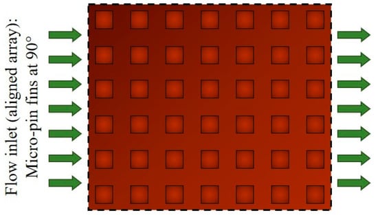 An alternative to modifying the configuration of microchannels to minimize the instabilities presented in this system is using segmented or microfinned microchannels (micro pin fins). Such compact heat sinks can be used in high-power laser cooling systems, high-concentration photovoltaic cell cooling, microreactor cooling, fuel cells, and microchips. In addition to the advantage of segmented microchannels in terms of increasing the heat exchange area to volume ratio, which provides an ability to dissipate higher heat rates, they can also be manufactured on the chip scales of electronic devices. The recent development of microfabrication techniques has allowed complex geometries on a reduced scale; thus, in recent years, several studies involving heat transfer in micro pin-fin heat sinks have been carried out in order to characterize the heat transfer mechanisms and to predict the thermal and fluid dynamic behavior of these systems. The micro fins can have different shapes and sizes and be arranged in different patterns to improve heat transfer [,,]. It is also noteworthy that the ideal spacing of the fins depends on the working fluid and its subcooling in the system. The mini and microfinned channel arrangements are considered promising structures for compact heat sinks [].