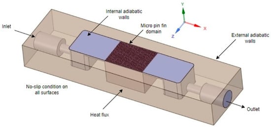 As a reference pressure, atmospheric pressure was defined; considering the characteristics of a low-pressure system, the outlet pressure was set up as zero. The no-slip condition was considered on all the surfaces. The input parameters for the simulation, such as inlet mass flux and the dimensions of the micro pin fins, were taken from the experimental approach. The heat flux was distributed through the micro pin fins, except for the top side, which was thermally insulated by a polycarbonate piece; for the inlet and outlet plenums, adiabatic wall conditions were considered.