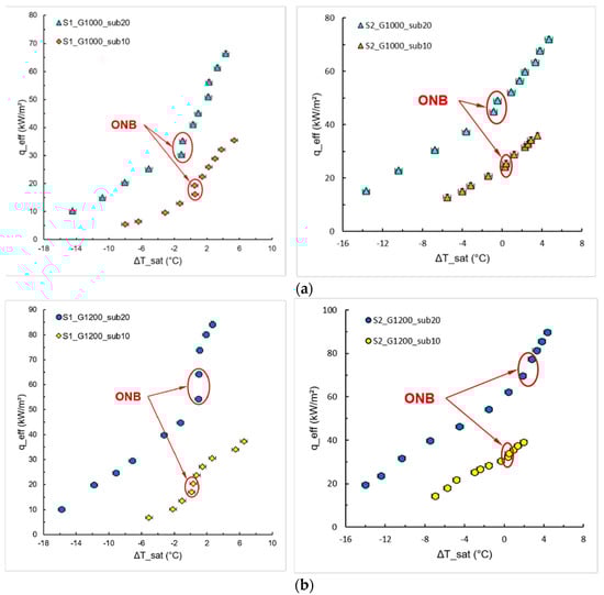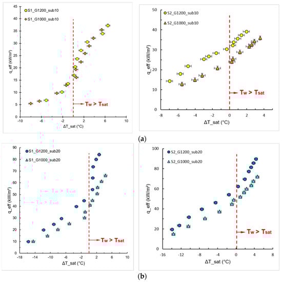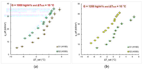 Figure 9 shows the effect of pin fin height on the boiling curves for different mass fluxes and a subcooling inlet temperature of 10 °C. Considering the effective heat exchange area, we can infer that the increase in the effective area leads to an increase in the HTC, characterized by the shift of the boiling curve to the left. The same was reported by Kiyomura et al. [], who evaluated different configurations of micro fin surfaces during pool boiling of the HFE-7100. One can observe in Figure 9 that S2 presents a better HTC, since its effective heat exchange area is approximately 55% greater than S1.