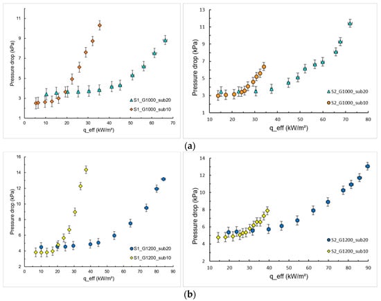Effect of inlet subcooling on the pressure drops for S1 and S2. (a) G = 1000 kg/m2s; (b) G = 1200 kg/m2s.