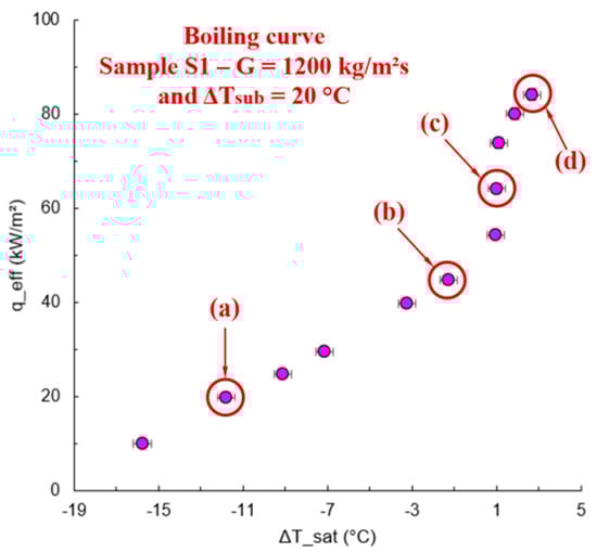 In order to discuss the flow boiling behavior, Figure 10 presents the boiling curve for S1 with G = 1200 kg/m2s and subcooling of 20 °C, with the respective visualization points. It is worth mentioning that similar behavior was observed for all test conditions. Flow boiling videos under these conditions can be found in the Supplementary Material.