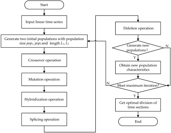 - The initial population I and II are set up based on the chromosome length. Based on a priori knowledge, the initial population I and II of individuals are selected. The length of population I chromosome is L1 and the length of population II chromosome is L2. The chromosome length represents the number of the divided time sections and the chromosomes are coded using binary. The sizes of population I and II are pop1 and pop2, respectively.