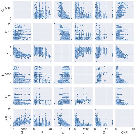 To construct the proposed framework, an extensive selection of non-proprietary experimental data on CHF available in the literature was utilized. The resulting dataset comprises 5877 samples, encompassing a wide range of system parameters, as demonstrated by the asymmetric distribution shown in Figure 1. The dataset encompasses both geometric and hydraulic features, with input variables obtained from the raw data including pressure (P), mass flux (G), tube equivalent diameter (D), local equilibrium/exit quality (x), and heated length (L). The output to be predicted is CHF, under the assumption that the distribution of heat flux along the axial direction is consistent or uniform. Table 1 provides a summary of the experimental ranges for the dataset. In order to improve prediction accuracy, input variables are standardized (i.e., normalized to have a mean of 0 and a variance of 1).