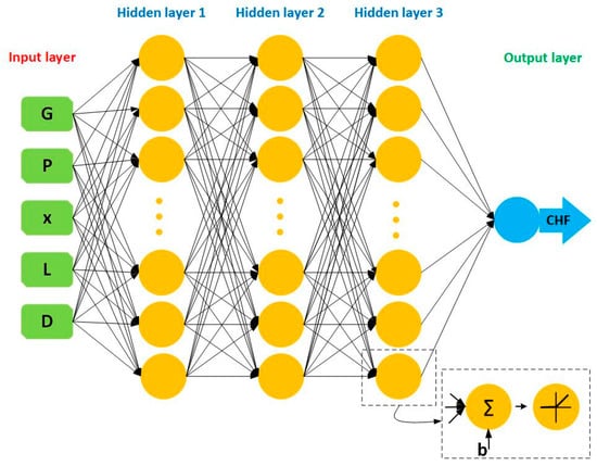 ANN is a machine learning (ML) technique that is inspired by the functioning of the human brain. It comprises numerous processing units called neurons. The feed-forward neural network is the most widely used type of ANN in engineering today [56,57]. Typically, a neural network consists of three layers: the input layer, one or more hidden layers, and the output layer. A neural network is a type of machine learning model that is capable of learning both linear and non-linear patterns between the data [58]. It achieves this by incorporating several hidden layers and non-linear activation functions. During the training phase, the network’s accuracy is improved by adjusting the weights and biases of the neurons. This iterative process is known as learning, which involves minimizing the difference between expected and actual outputs. The weights and biases are randomly initialized, and the backpropagation learning technique is commonly used to adjust them. Neurons in each layer are connected to neurons in the next layer through weights, creating a complex network that can learn and make predictions. Each neuron has a threshold value, also called “bias”, employed to provide an extra degree of freedom. Inputs are multiplied by their corresponding weights in ANN. These weighted values and the neurons’ bias are added together as follows: