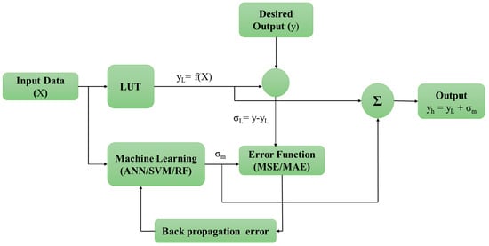 For the development of the proposed hybrid framework, the LUT is chosen as the prior model. In contrast to best-estimate standalone models, this hybrid framework utilizes a data-driven model as the foundation and offers a basic solution, while ML techniques are used to extract new knowledge from the discrepancy between the actual and anticipated result. For the prediction of CHF, input vector X consists of five variables, i.e., heated length (L), pressure (P), exit quality (x), mass flux (G), and equivalent diameter (D). Figure 4 depicts the flow of its training, validation, and testing methodology. The anticipated output (yL) of the data-driven model is fundamentally a non-linear function of the input variables. During the learning process, as depicted in Figure 4, the error (σ) is calculated by subtracting yL from the experimental output (y). The error (σ) obtained from the predicted values is utilized to train the ANN, SVR and RF. The predicted errors (σm) from ANN, SVR, and RF are compared with the error (σ) using an error/cost function. Typically, the loss function is presented in the form of mean absolute error (MAE) or mean squared error (MSE). The loss function is generally presented by MAE or MSE. The error function is optimized (minimized) during the learning/training process. The final prediction of the hybrid model yh is the sum of yL and σm. Relative root-mean-square error (rRMSE) is used to measure how well the hybrid model performs when evaluated against experimental results. The rRMSE is described as