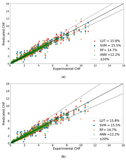 (a,b). Experimental vs. predicated CHF for standalone best-estimate models (LUT vs. SVM vs. RF vs. ANN).