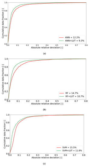 Absolute-relative deviation vs. data fraction of hybrid ANN+LUT (a), RF+LUT (b), SVM+LUT (c), and standalone ML models.