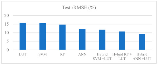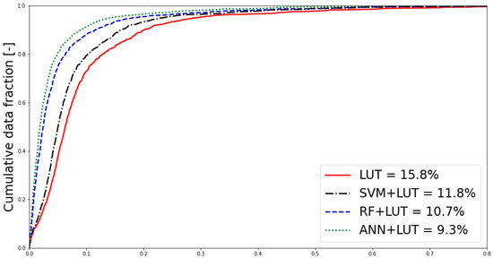 Furthermore, ML techniques also perform well compared to the LUT approach. However, the ANN-based hybrid approach outperforms as compared to ML techniques and the LUT approach, emerging as the clear winner. This is evidenced by a significantly smaller rRMSE of 9.3% and a faster rising cumulative data fraction curve, indicating fewer predictions that deviate from actual data.