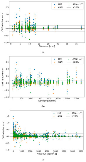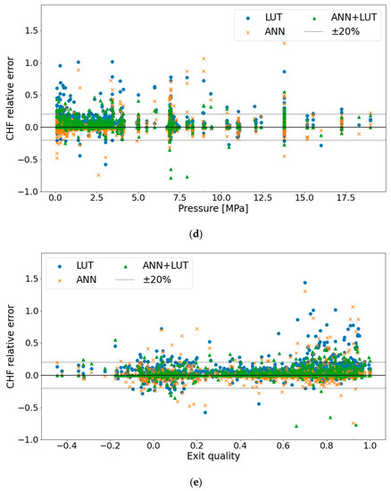 In addition, the hybrid model (ANN + LUT) over the ranges of practical importance also corrects substantially distributed and biased parametric trends (CHF relative error vs. tube diameter, heated length, mass flowrate, pressure, exit quality) as depicted in Figure 10 using standalone LUT or ANN models. Such findings have further supported the hybrid approach’s improved generalization capacities.
