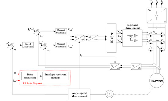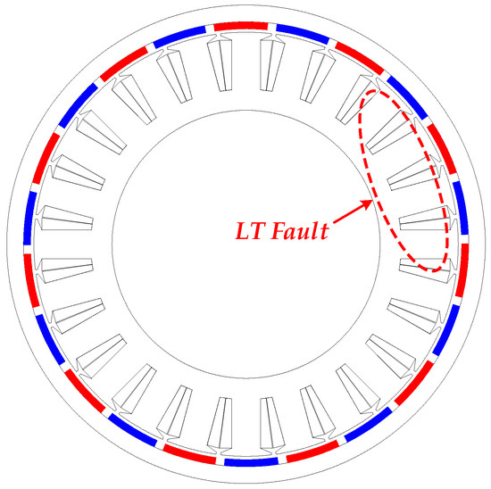 Interest in continually developing techniques for the diagnosis of faults in electrical machines is related to several factors. Firstly, the overall number of embedded motors that are employed in different applications, such as industrial systems, renewable energy generating systems, and HEVs [4]. However, owing to the ageing of materials, manufacturing faults, or sever conditions, various types of electrical, mechanical, and magnetic faults can occur in the machine [5], for example: open phase faults, interturn short circuit faults, lack of turns (LTs) faults in the stator winding, eccentricity, demagnetization, and magnetic circuit faults [6]. Hence, the integration of detection strategies, diagnosis, and fault-tolerant control becomes unavoidable. Moreover, during the real operation of the ER-PMSM, LTs faults may emerge due to manufacturing tolerances or ageing issues. Therefore, once the LTs fault appears, the stator current increases to generate enough torque, which leads to torque and speed ripples, and further exacerbates thermal problems. As a result, early diagnosis of the LTs fault is critical for preventing deterioration of ER-PMSM performance and reducing eventual losses by implementing the most effective corrective measures. These measures may consist of repairing the faulty machine or, in certain situations, appropriately reconfiguring the control strategy [6].