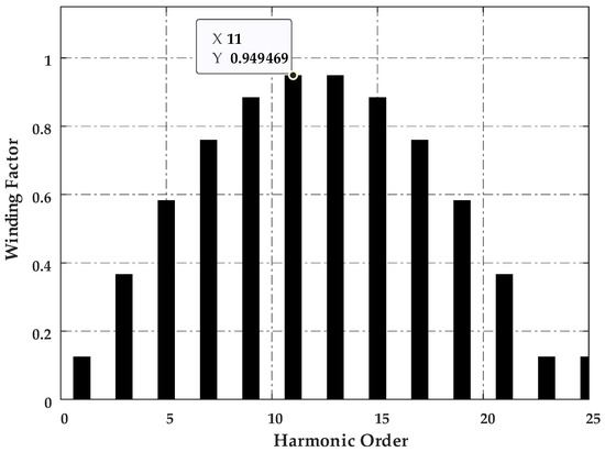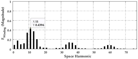 According to Figure 4, the spectrum represents the spatial distribution of the winding factor. The maximum torque of the machine generated in the air-gap will be created by the h11 component, with a winding factor of 0.949. This component corresponds to the fundamental, with a rank h = p.