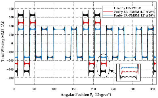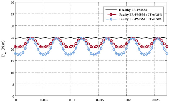 In Figure 13, the ER-PMSM is operated at nominal load. The temporal representation of the output torque of the machine by FEA for the three cases is provided. In the LTs fault circumstances of 25% and 50% of phase A, the torque decreases accordingly concerning the healthy state, according to the fault’s severity level. Moreover, due to the change of its symmetry, torque ripples appear, which are due to the growth of harmonics. The evolution of the faulty torque reveals torque ripples corresponding to the double of the frequency, owing to the decrease of the resistance and the inductance of a phase, which makes the bandwidth wider. The results concerning the torque are provided in Table 2. It can be observed that the level of the torque ripples is related to the severity of the fault.