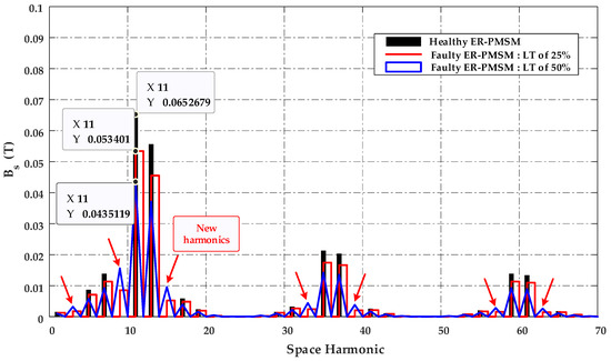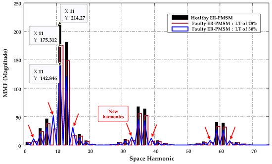 A comparison between the harmonic content of the MMF is presented in Figure 6. Evidently, when the machine is subjected to the LTs fault, all of the odd harmonics are present in the spectrum, as well as the appearance of new harmonics that are due to the LTs fault levels (Red arrows).