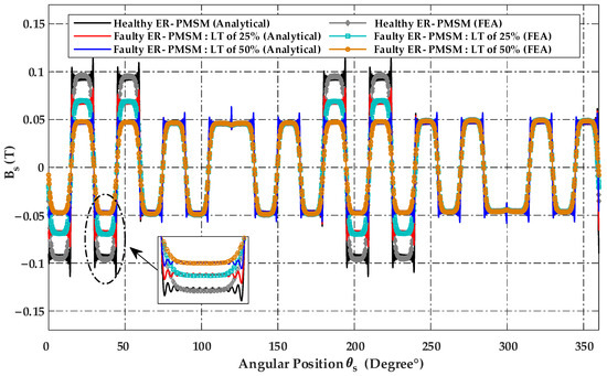 Figure 9 illustrates the radial air-gap flux density at no load obtained by the analytical model and the FEA model in the healthy and faulty states according to the two LT fault levels. In the case of an unbalanced stator winding fault, the amplitudes of the no-load flux density waveforms drop. However, all analyses are consistent with the analytical analyses.