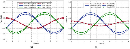 Figure 11 shows the total fluxes generated by the stator power supply in the two situations of the LTs fault of 25% and 50% of phase A, developed theoretically using the analytical model described previously, and the finite element method at a speed of 600 rpm. Due to the change in the stator winding induced by the fault in phase A, an unbalance arises depending on the level of the fault, which leads to torque ripples (Figure 13). This analysis will be used to determine the inductance of the machine in the presence of the fault. The inductances take a critical role in the modeling process, since they consider the many phenomena that might appear within the machine. Accurate modeling will lead to additional information of the signals and a good compromise in terms of the accuracy of the model.