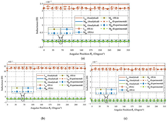 Comparison between inductances derived by the analytical approach, FEA, and experimental measurements. (a) Healthy inductances; (b) faulty inductances with 25% of LTs fault; (c) faulty inductances with 50% of LTs fault.