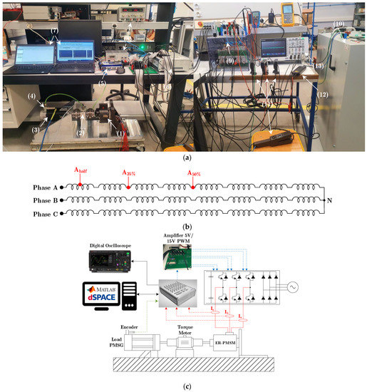 Experimental setup. (a) Global view of the test bench setup for control and diagnosis of the ER-PMSM; (1) ER-PMSM 1.5 kW; (2) torque meter T22/50 Nm; (3) load PMSG; (4) encoder; (5) MX440B module; (6) dSpace 1202 MicroLabBox; (7) MATLAB/Simulink ControlDesk platform; (8) DC power supply; (9) Semikron 3Φ inverter; (10) power supply 3Φ/50 Hz; (11) current sensors; (12) voltage sensor; (13) digital oscilloscope. (b) Structure of the stator winding of the ER-PMSM; (c) block diagram of the setup.