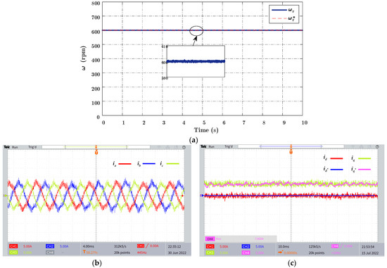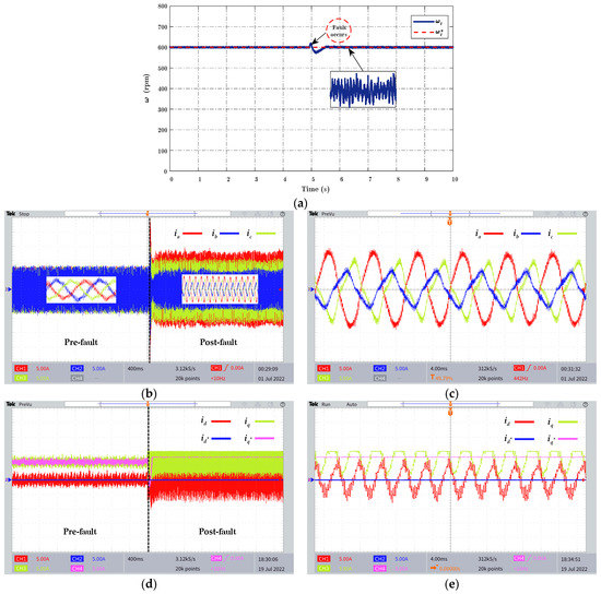 Figure 14c depicts a synoptic diagram of the experimental implementation that indicates the experimental validation of the ER-PMSM control results in the healthy condition with an LTs fault of 25% and 50%. The experimental results are acquired by a digital oscilloscope linked to the real-time interface. The choice of the sampling frequency significantly impacts the quality of the signals, particularly the phase currents, speeds, and electromagnetic torque, and whatever the control algorithm used. For each healthy/faulty scenario, a load torque condition is tested: 8 Nm for a speed of 600 rpm. In this section, we present the experimental results illustrating the behavior of the ER-PMSM impacted by 25% and 50% LTs fault in its stator winding. Figure 15 depicts the flow chart of the control loop used in this paper with the LTs fault diagnosis.
