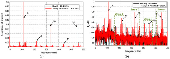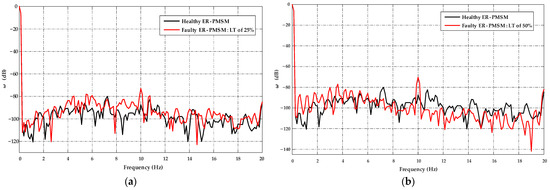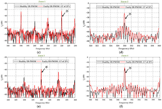 (a–f) Experimental current spectrum of the ER-PMSM at 8 Nm load and 600 rpm, in healthy and faulty conditions with an LTs fault of 25%.