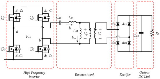 The full-bridge inverter generates a sine wave voltage between and with a duty cycle of 50%. In addition, the nominal operating frequency is kept fixed. Considering the standardization trend of the International Automobile Technology Association, the operating frequency for electric vehicle wireless charging systems is fixed at 85 kHz, which lies within the internationally available operating frequency band (81.38 kHz–90.00 kHz) [7]. Under the assumption that the full-bridge inverter operates at a fixed frequency, the WPT system is defined as expressed in Equations (7)–(10).