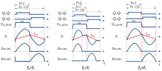 Except for the fact that the resonant circuit composed of , , and is serially connected, the circuit structure is identical to that of a typical full-bridge DC-DC converter [19,20,21], wherein the on the secondary side of the transformer is converted to the primary side. The waveform changes according to the resonant frequency and the switching frequency, which are plotted in Figure 7, showing the voltage and current waveforms of each part according to the magnitude of the switching frequency and the resonant frequency.