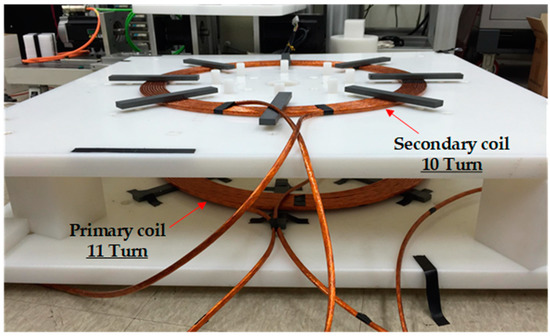 Figure 9 shows the coils manufactured in this study. The transmission coils are both 800 mm in diameter, and the distance between the coils is 150 mm. In addition, eight ferrite cores were placed in each coil, improving the coupling coefficient between coils. The manufactured coil is a commonly used coil system designed to check the efficiency that changes according to the alignment of the coils.