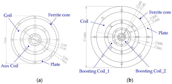 Figure 11 and Figure 12 show the specifications of the circular 2-coil system, including the size and shape of the coils, the number of ferrite cores, and other parameters. The primary coil is designed to be wider than the secondary coil, minimizing the reduction in transmission efficiency due to poor coil alignment.
