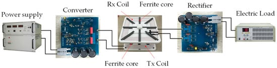 The proposed experimental setup for wireless power transmission is visualized in Figure 15, which includes a power supply unit, a power transmission module (consisting of a transmitter module, coils, and receiver module), and an electric load. The primary transmitter unit in the power transmission module consists of a full-bridge converter circuit, overcurrent and overvoltage protection circuits, and a controller circuit. The secondary receiver unit comprises a diode-based rectifier circuit and a capacitor. To measure transmission efficiency, input/output voltage and current were measured using a digital multimeter for high power. An input source configured the input power of the system using a high-power DC power supply capable of supplying up to 15 kW, and a high voltage DC electric load with a capacity of 600 W–14.4 kW was used on the power terminal.