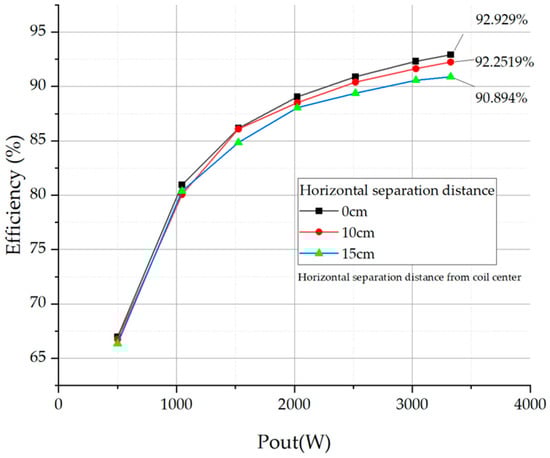 Table 3 and Figure 19 provide detailed measurements of the efficiency changes observed in the two-coil wireless power transmission system manufactured for this study. The results indicate that power transmission efficiency varies significantly depending on the load and alignment of the coils. Specifically, the efficiency decreases as the load decreases, and the highest efficiency of 92.9% was observed at the maximum output capacity of 3.3 kW.