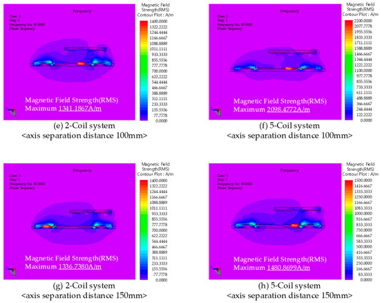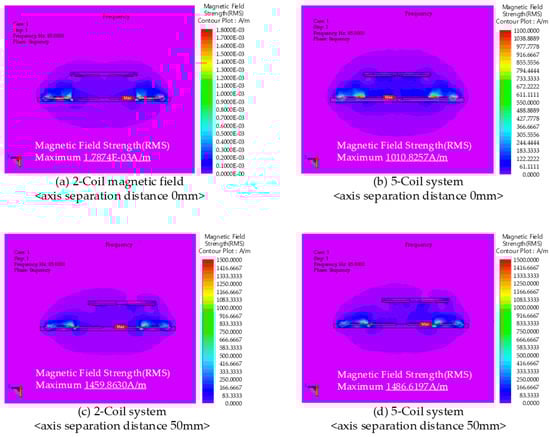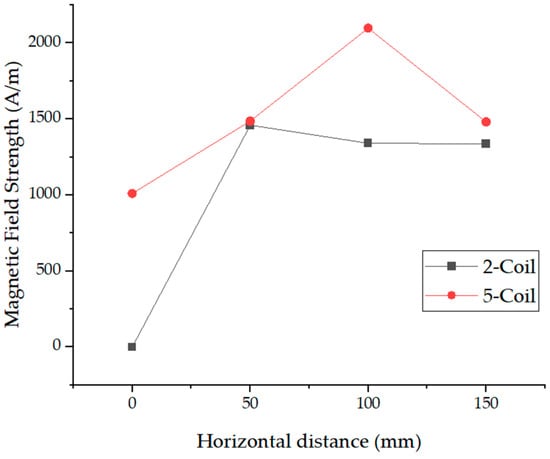Figure 20 shows that the magnetic field intensity graph of the five-coil system with boost coils is more potent than that of the two-coil system. When the coil centers are aligned, the magnetic field intensity of the two-coil system is close to zero due to the difference in coil diameters, indicating no coupling between the coils. Except for when the coils are aligned, both systems generate magnetic fields up to a horizontal separation distance of 150 mm. However, it was confirmed that the magnetic field intensity of the five-coil system with boost coils is more potent than that of the two-coil system. In particular, it was observed that the effect of the boost coil is most significant at a separation distance of 100 mm.