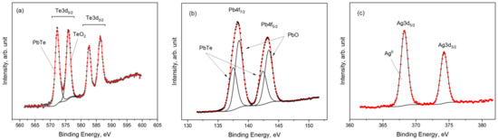 Te3d (a), Pb4f (b), and Ag3d (c) spectra acquired by the investigation of the sample PbTe10.