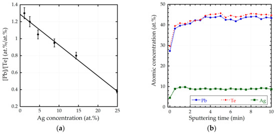 (a) [Pb]/[Te] atomic concentration ratio as a function of the Ag concentration; (b) XPS depth profile for the sample PbTe05.