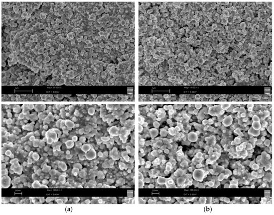 An evident and characteristic granular nanosized structure is clearly visible in micrographs obtained by SEM, as shown in Figure 3 for samples PbTe05 and PbTe20. The other samples show very similar morphologies and, for brevity, are not reported. An estimation of the size of the granules was carried out via open-source software for imaging analysis (ImageJ, National Institutes of Health, Bethesda, MD, USA) [44]. The size of the granules is randomly distributed from about 220 nm (constituted by few crystallites) down to approximately 30 nm (consisting of single crystallites).
