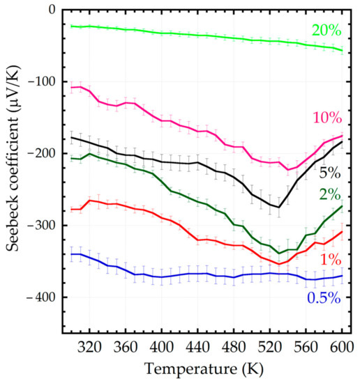 An analysis of the thermoelectric behavior was performed as a function of temperature in the range 300–600 K. Figure 5 shows the Seebeck coefficient (S) for the investigated samples, obtained from ten measurements performed consecutively after repeated heating/cooling cycles to also test the system repeatability (represented by the error bars in the figure). We found for all the samples a negative sign of S, indicating an n-type (electrons) conduction for the majority carriers. At the same time, the absolute value decreases as a function of the Ag concentration, with the sample PbTe20 showing a very low value of S, about one order of magnitude lower than PbTe05. This trend can be expected since the presence of the dopant should increase the carrier concentration. Indeed, according to the electron transport models that are typically used, i.e., the single parabolic band model, S depends on the carrier concentration, such that the lower the carrier concentration, the larger the Seebeck coefficient [7].