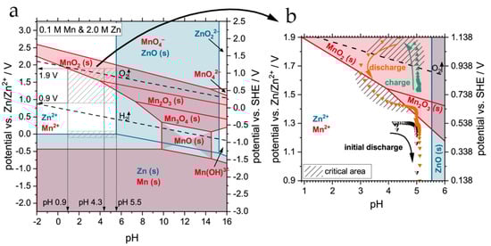 (a) Thermodynamic operating window of the zinc-ion battery with respect to the pH value. (b) Zoomed area and pH-E plot of the cycling path of the battery cell with the 2 M ZnSO4/0.1 M MnSO4 electrolyte (positive orientation, shaded area should be avoided for cycling) [20].