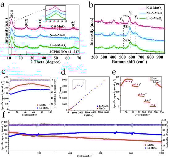 (a) XRD patterns and (b) cyclic performance at current density 0.3 A∙g–1 of X-δ-MnO2 (X = Li, Na, K) [23]. (c) Cycling performance of MnO2 and Li-MnO2 electrodes at a current density of 0.1 A g–1 [32]. (d) EIS spectra of MnO2 and Li-MnO2 at open-circuit voltage [32]. (e) Rate performance of Li-MnO2 electrode at current densities from 0.1 to 2 A g–1 [32]. (f) Long-term cycling performance of MnO2 and Li-MnO2 electrodes at a high current density of 1 A g–1 [32].